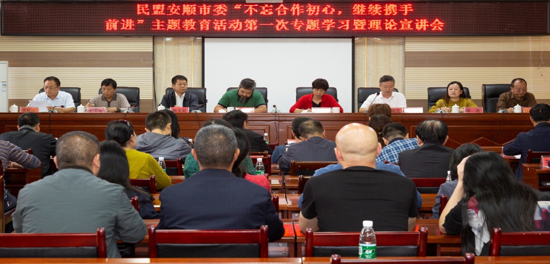 2019年10月10日下午,民盟安顺市委“不忘合作初心,继续携手前行”主题教育活动第一次专题学习暨理论宣讲会在安顺学院举行。民盟安顺市委邀请全国人大代表、民盟贵州省委副主委(兼)、贵州民族大学图书馆馆长卢云辉作主题教育活动专题宣讲报告。安顺市政协副主席张宜微出席会议。民盟安顺市委委员,民盟市、县(区)人大代表、政协委员,安顺学院民盟支部全体盟员参加会议。宣讲会由民盟安顺市委主委潘祖伦主持。