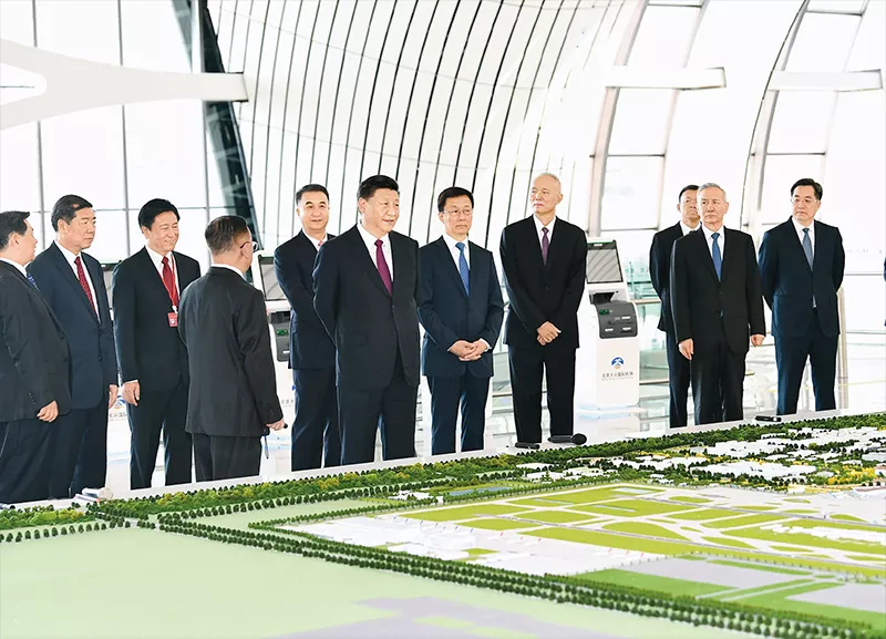2019年9月25日上午,北京大兴国际机场投运仪式在北京举行。中共中央总书记、国家主席、中央军委主席习近平出席仪式,宣布机场正式投运并巡览航站楼。这是习近平在综合交通中心听取机场综合交通体系建设情况介绍。新华社记者谢环驰/摄