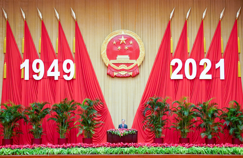 汪洋指出,今年是中国共产党百年华诞,这在党和国家历史上、中华民族历史上都具有极其特殊的意义。习近平总书记在庆祝中国共产党成立100周年大会上发表重要讲话,全面回顾党的百年奋斗征程,鲜明提出伟大建党精神,深刻阐述以史为鉴、开创未来的根本要求,极大激发了全体中华儿女的壮志豪情。中国共产党是有理想有担当、有力量有功绩、有自信有定力的政党,始终把人民放在心中的最高位置,始终把实现民族复兴作为一切奋斗、一切牺牲、一切创造的主题。经过持续奋斗,我们胜利实现了第一个百年奋斗目标,正在意气风发向着第二个百年奋斗目标迈进,每一个中华儿女都有理由为之自豪。只要毫不动摇坚持党的领导,坚定不移走中国特色社会主义道路,紧紧依靠人民群众,加强中华儿女大团结,任何艰难险阻都阻挡不了中华民族迈向伟大复兴的铿锵步伐。